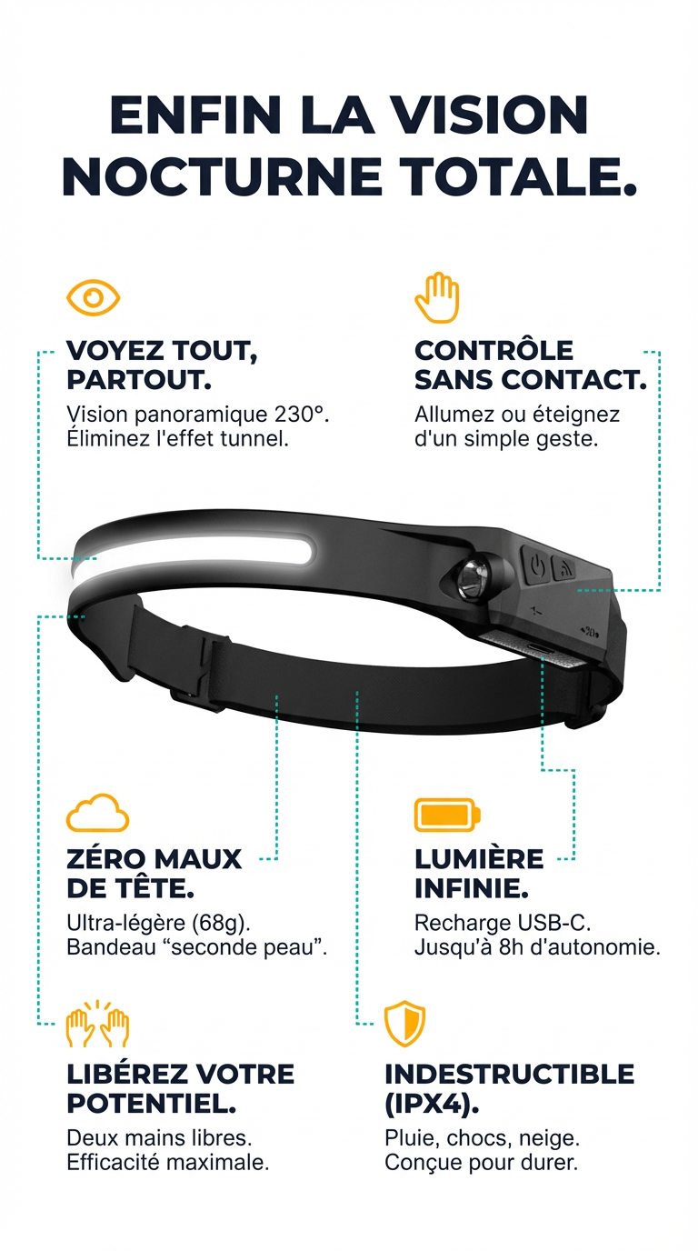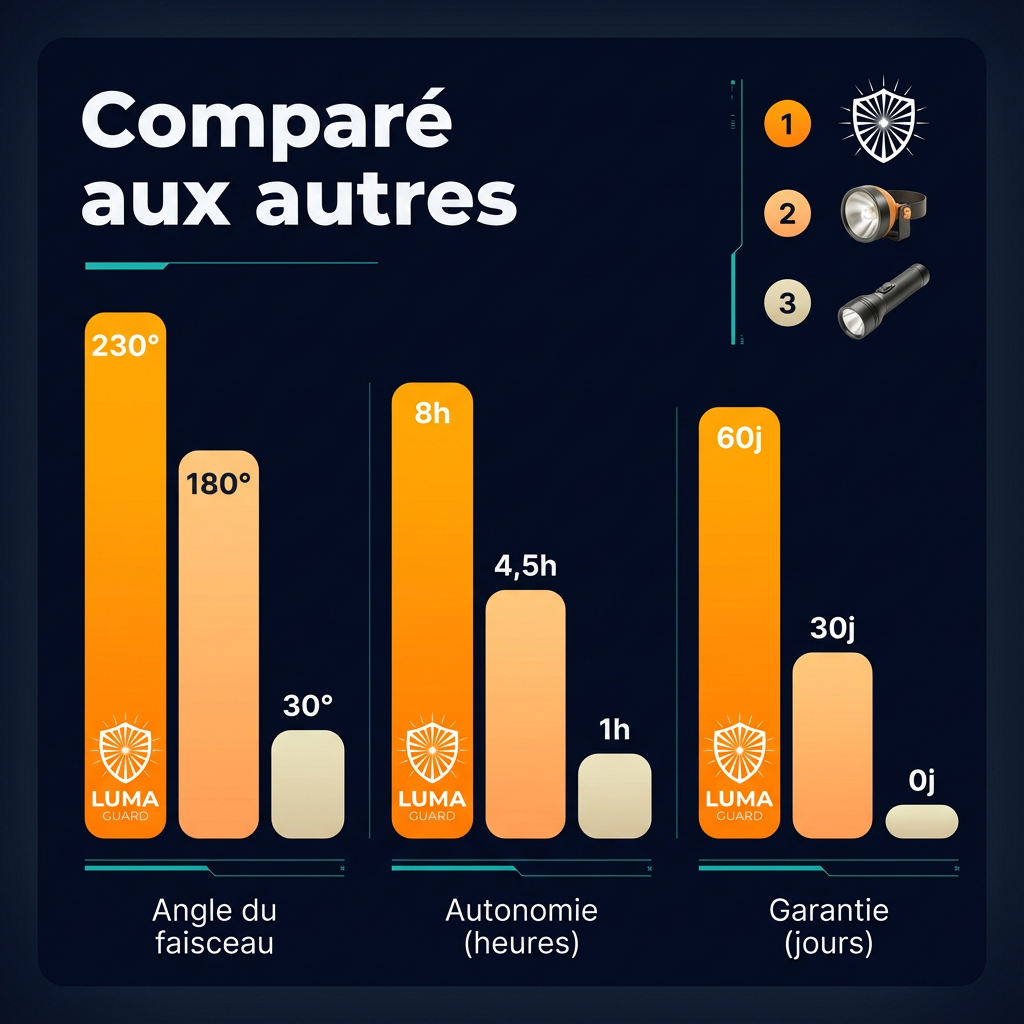 Absolument. La plupart des lampes créent un "effet tunnel" (un rond lumineux devant vous) qui laisse les côtés dans l'ombre. La LumaGuard™ offre un faisceau large à 230°. Vous ne regardez pas juste devant vous, vous illuminez toute la pièce ou le sentier instantanément, comme en plein jour.