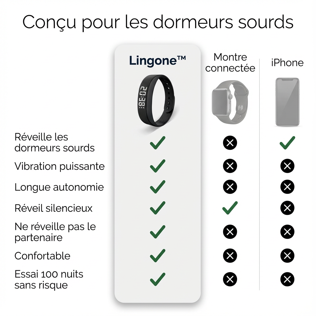 La différence réside dans la puissance du moteur. Les montres connectées sont faites pour des notifications discrètes (SMS, emails). Notre bracelet est équipé d'un moteur dédié au réveil, délivrant des vibrations jusqu'à 3 fois plus intenses qu'une montre standard.